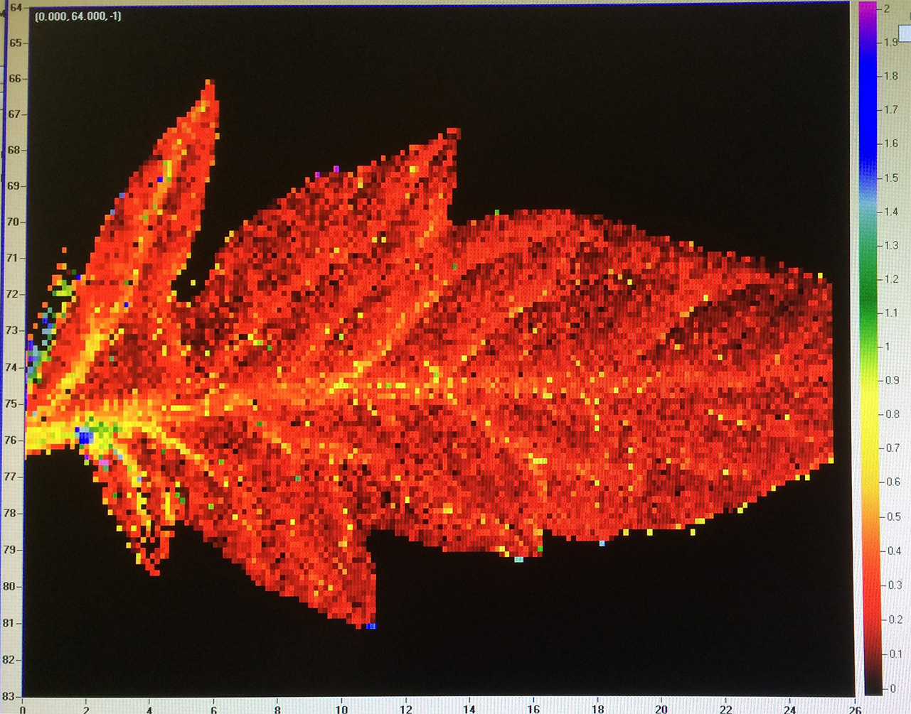 Detailed false color map of tomato leaf measured by the system shown in the previous image. (All scales are in mm)